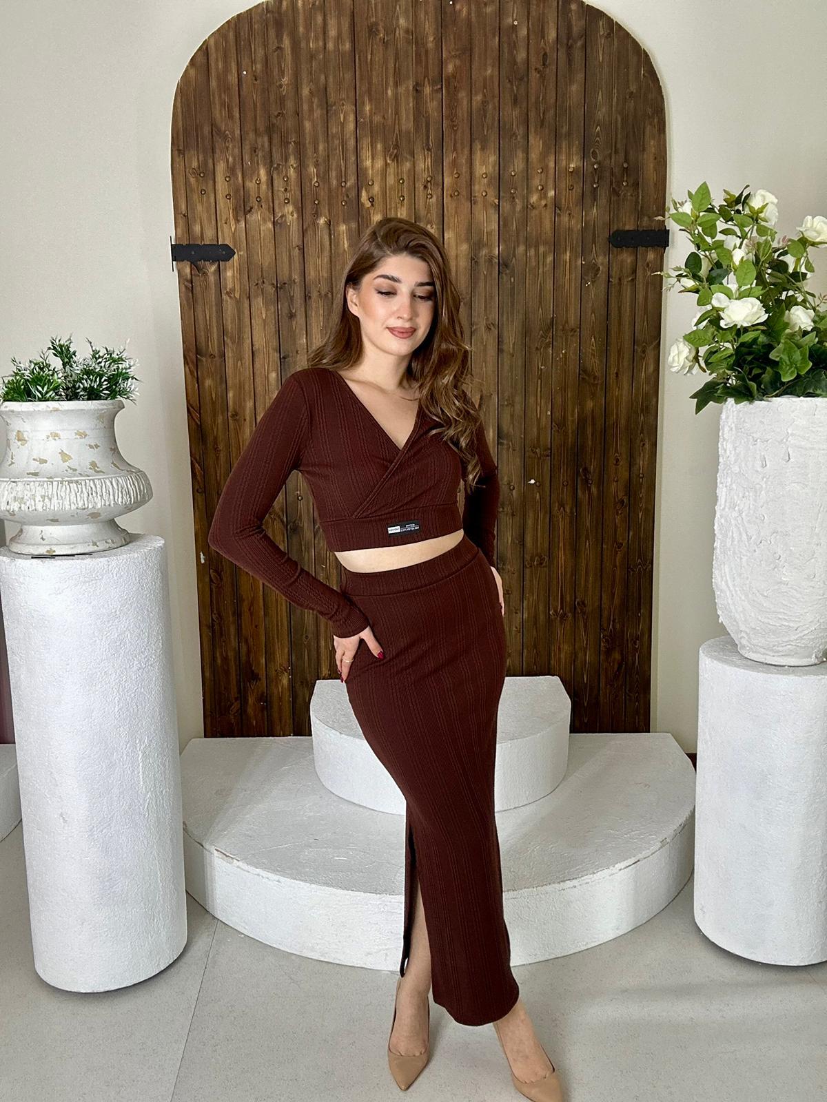 Burgu Kumaş Armalı Crop Kalem Etek İkili Takım Kahverengi (10088-3)