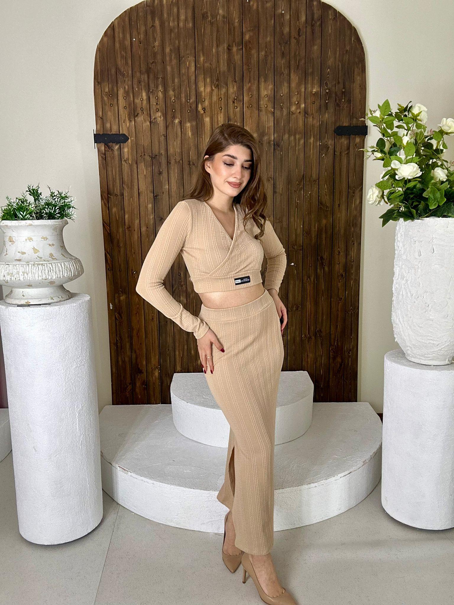 Burgu Kumaş Armalı Crop Kalem Etek İkili Takım Krem