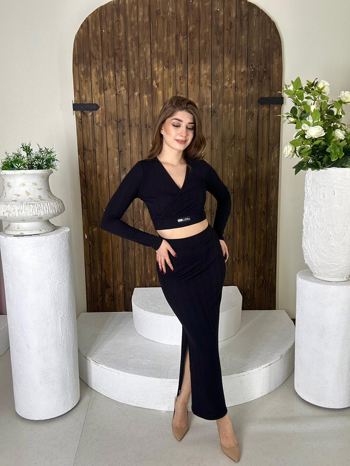 Burgu Kumaş Armalı Crop Kalem Etek İkili Takım Siyah (10088-1)