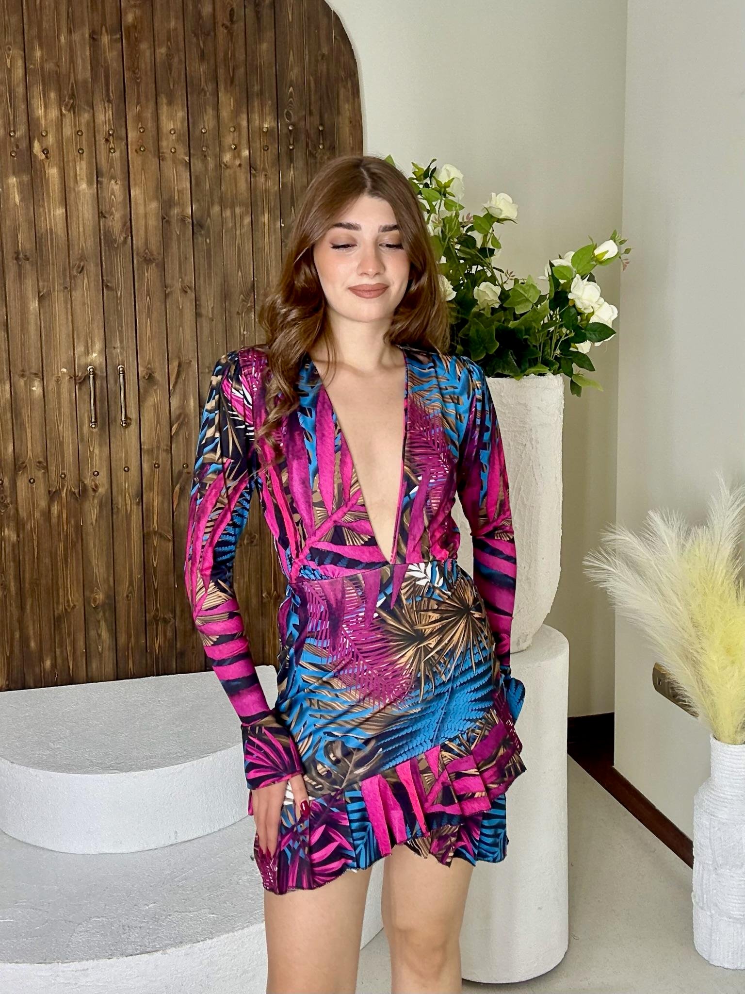 Full Likralı Micro Kumaş Derin V Yaka Desenli Elbise Mor