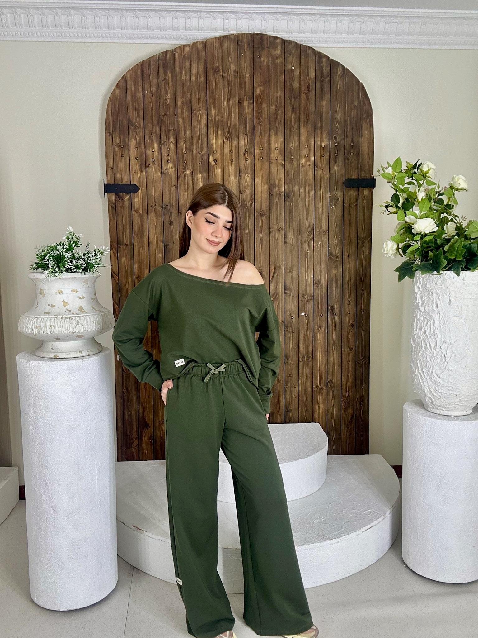 İki İplik Kumaş Arma Detaylı Kayık Yaka İkili Takım Haki