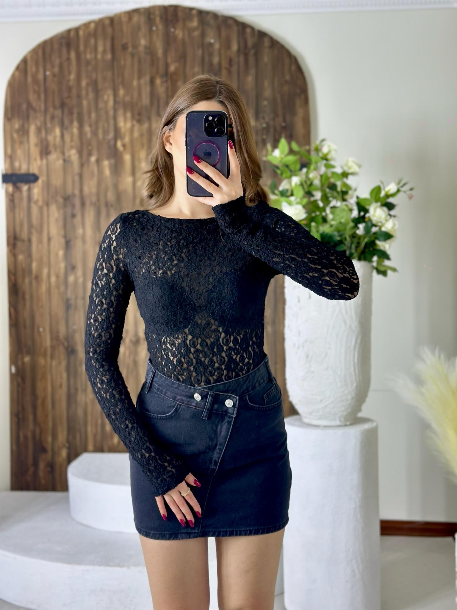 Likralı Dantel Kayık Yaka Bluz Siyah (10064)