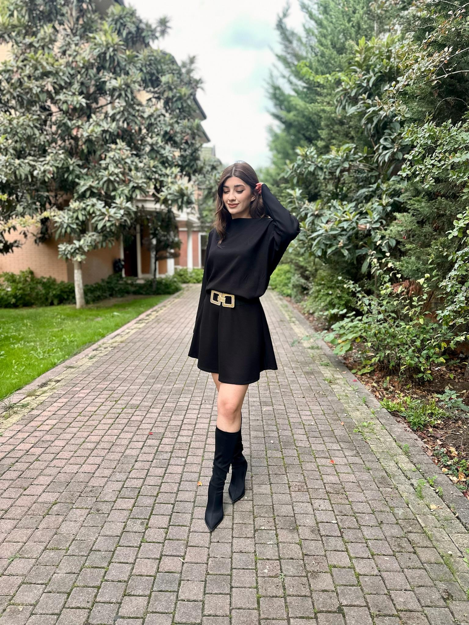 Oys Modal Kumaş Kloş Etek Düşük Omuz Bluz İkili Takım Siyah (10135)
