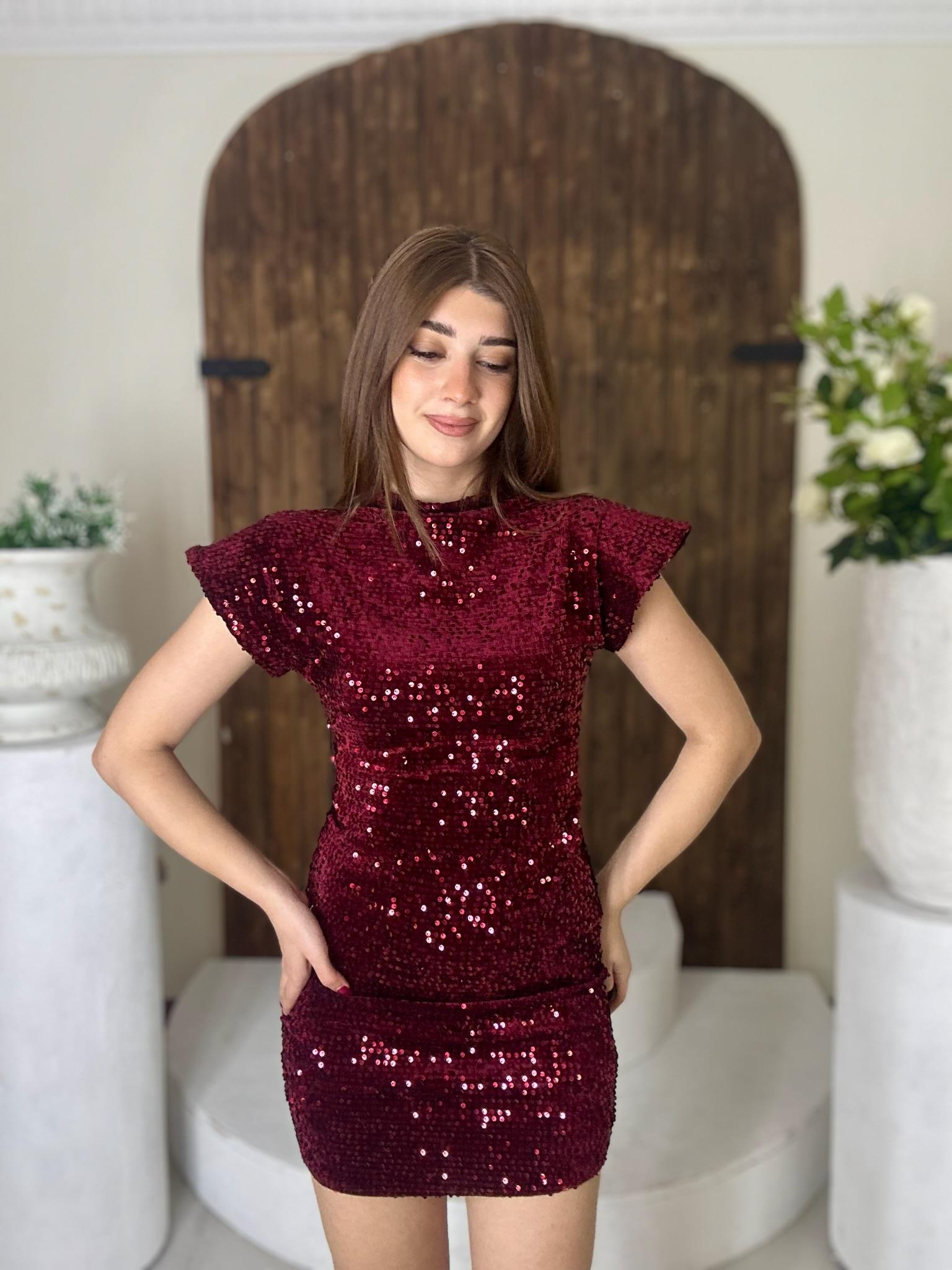 Payet Kumaş Düşük Kol Likralı Tasarım Elbise Bordo