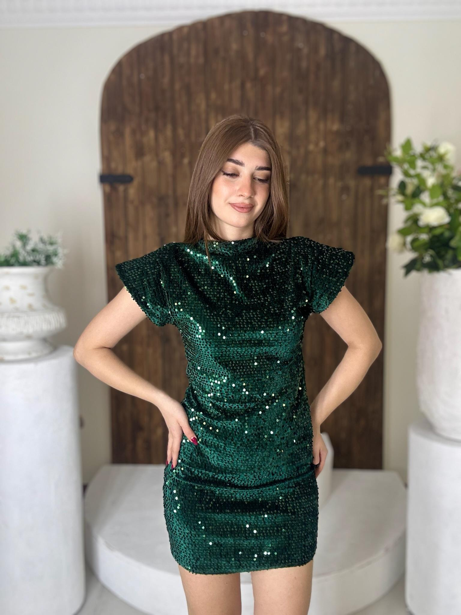 Payet Kumaş Düşük Kol Likralı Tasarım Elbise Yeşil (9306-2)